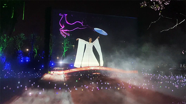 全息纱幕投影名为“湖中仙境”,每个纱幕投影面积为4m×6m,分别位于龙桥的两侧。纱幕上,白衣仙子持伞起舞,花朵、神鹿萦绕左右,在灯光,雾气,以及海棠花林的衬托下,两扇纱幕纷纷化作两位真正的花仙,将人们引入海棠花的世界。