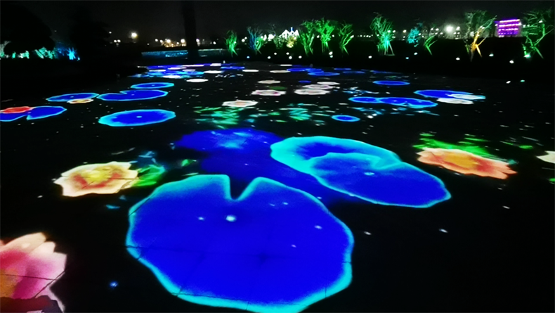 3号岛的地面投影项目名为“梦幻海棠”,整个演出总面积为1500平米,以海棠、莲叶、锦鲤为主要元素。夜幕下,地面上的海棠花朵不断飘落变幻,活泼的游鱼在莲叶见忽隐忽现,鱼群在影像追踪系统的作用下与游客相互追逐,一个如梦似幻的“岛中花海”跃然呈现在游客脚下。
